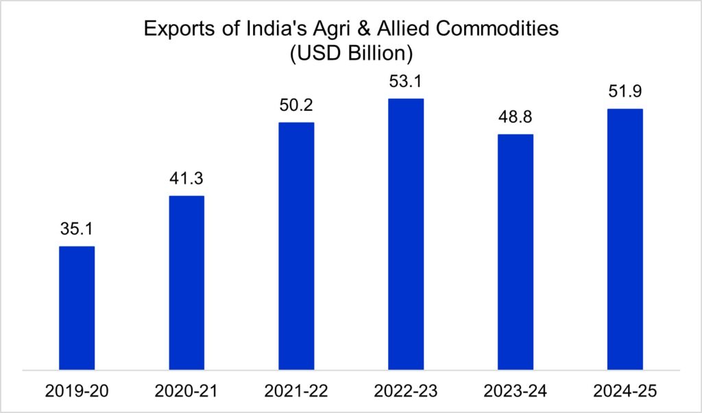 According to WTO Trade Statistics 2023, India is currently the eighth largest exporter of agricultural products in the world. Agriculture and allied products worth US$ 51.9 billion was exported in 2024-25.